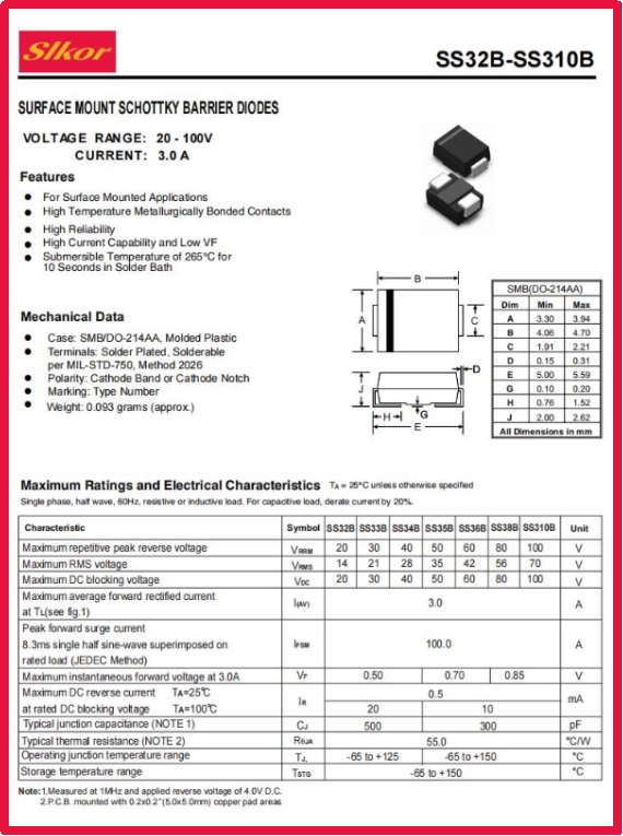从产品特征来看,ITB8888通博slkorSS36B肖特基二极管具有直流反向耐压60V、平均整流电流3A等参数,这使得它成为多领域的“全能选手”。
