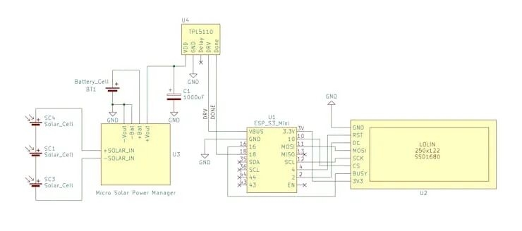 • 电源链路:太阳能板 → SPV1050 → 电池 → TPL5110 →(系统电源)→ ESP32-S3 & 墨水屏。