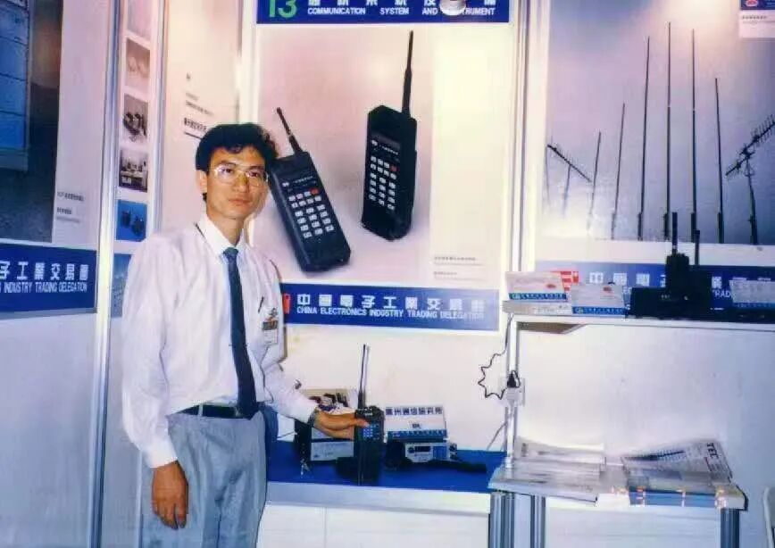 研发负责人汤锦基1993年和中国第一部国产大哥大合影(于香港参展)。