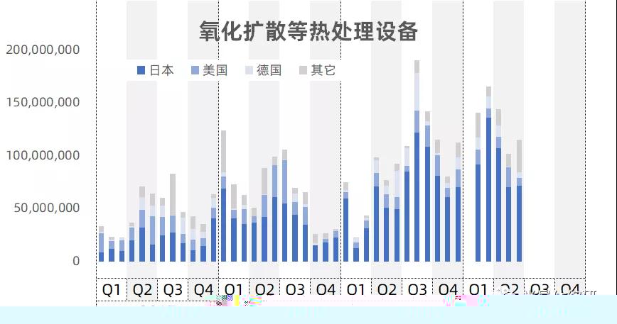 42个月,中国大陆进口氧化扩散等热处理设备约32.3亿美金。由图可见,从去年下半年开始,进口量金额大幅增加: